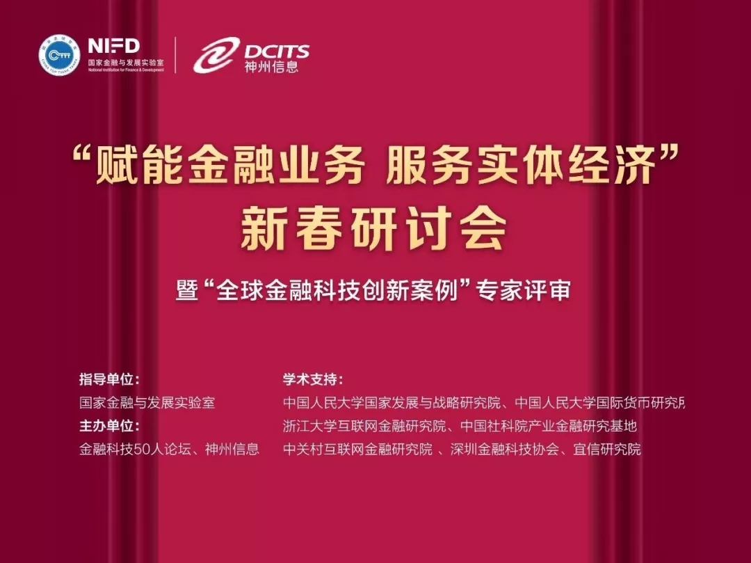 1月12日,“2020全球金融科技创新案例”专家评审及新春研讨会在北京举办,本期研讨会的主题是:赋能金融业务,服务实体经济。会议由国家金融与发展实验室作为指导单位,金融科技50人论坛(CFT50)与神州信息共同主办。国家金融与发展实验室副主任、CFT50 首席经济学家杨涛担任会议主持,神州信息副总裁马洪杰代表公司出席会议并参与评审工作。中国人民大学国家发展与战略研究院、中国人民大学国际货币研究所、浙江大学互联网金融研究院、中国社科院产业金融研究基地、中关村互联网金融研究院、深圳金融科技协会、宜信研究院等提供学术支持。