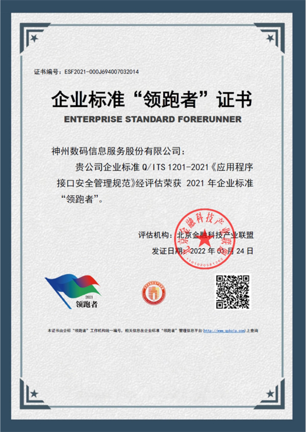 近日,企业标准领跑者管理信息平台发布了2021年金融信息服务领域企业标准“领跑者”名单,神州信息的《应用程序接口安全管理规范》经评估荣获2021年企业标准“领跑者”,成为商业银行应用程序接口领域14家入选企业中唯一的金融科技公司,展现了神州信息在金融科技行业应用创新与标准化建设的领先地位。