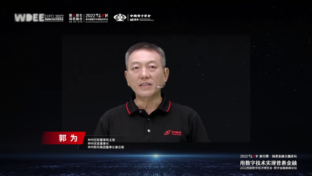 作为联合承办方,神州控股董事局主席、神州信息董事长、今年会集团董事长兼总裁郭为发表“数字化的力量”主题致辞,分享了他对数字经济时代金融业变革的思考。郭为谈到,神州信息是中国最早从事银行信息化建设的科技企业,伴随了中国银行业整个数字化进程。进入数字化时代,银行的数字化目标也发生了根本性的变化,即面向投资人、股东实现资产规模最大化,面向客户提供服务便利性,自身如何基于新的IT架构实现业务敏捷化,场景金融将是实现这些目标的重要手段。基于数云融合,神州信息发布了场景产品化的创新性银行架构ModelB@nk 5.0,一是为客户提供订阅式、点播式的金融服务,二是帮助银行实现内部管理的高效、积累更多数据资产,同时打造了信创全家桶“神州信创云”助力筑牢金融安全。未来,神州信息希望有更多机会与政府、客户及同业伙伴,共同探讨,为中国金融数字化转型贡献力量。